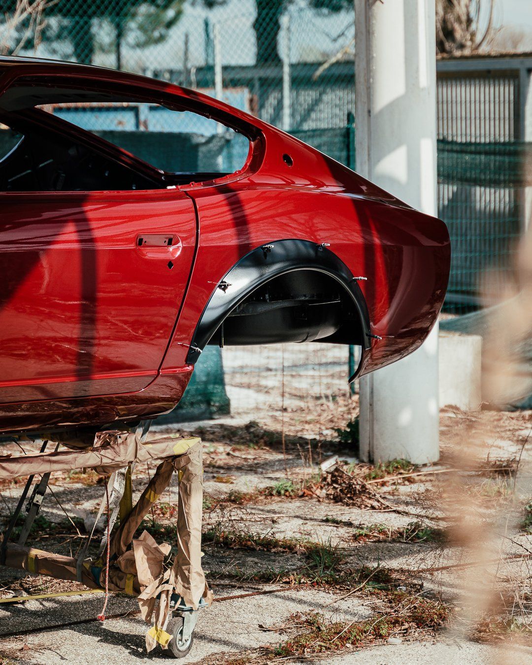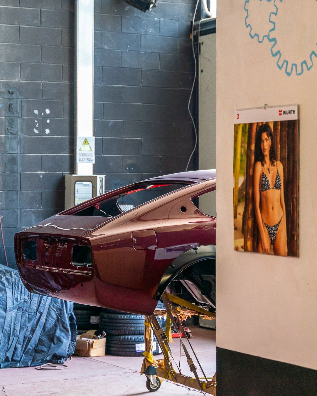 Finally, the restomod of the Datsun 240Z starts to take the shape we imagined and we can’t wait to show you the current state of the art.Let’s recap quickly: after a first phase of disassembly, restoration and replacement of damaged parts of the donor car, we moved on to the restoration of the bodywork and then to the painting room. There we say her goodbye, like a mother bringing her little girl to school.A few weeks later, we paid a visit to our production team to take the shots you’re looking at. You know, the workshop is that wonderful microcosm governed by the mechanics, who have a very personal idea of “order”, in which almost only they find themselves, and that’s fair! So, now imagine the happiness in their eyes when we arrive: “move this one”, “put away this one”, let’s place this here for a moment, that one we’ll leave there instead, it’s fine. It’s almost like playing Cops & Robbers, isn’t it? That’s also part of the game.