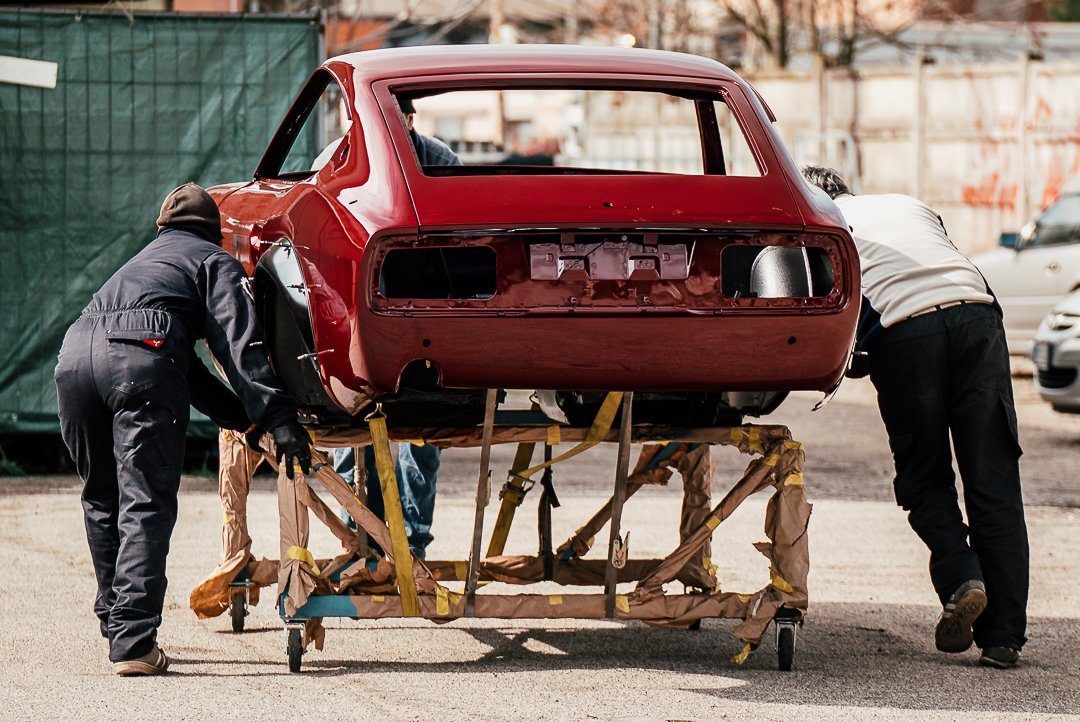 As we told you last time when we showed you the renderings, the exterior color chosen is a Rosso Cordoba MET – one of the official Ferrari colors – which is well suited to dress a car of the ’70s, and at the same time winks at the Italian soul of its future owner.And here we are, what do you think? Oh, soon we’ll put in the new engine, so be on the lookout for the next steps!