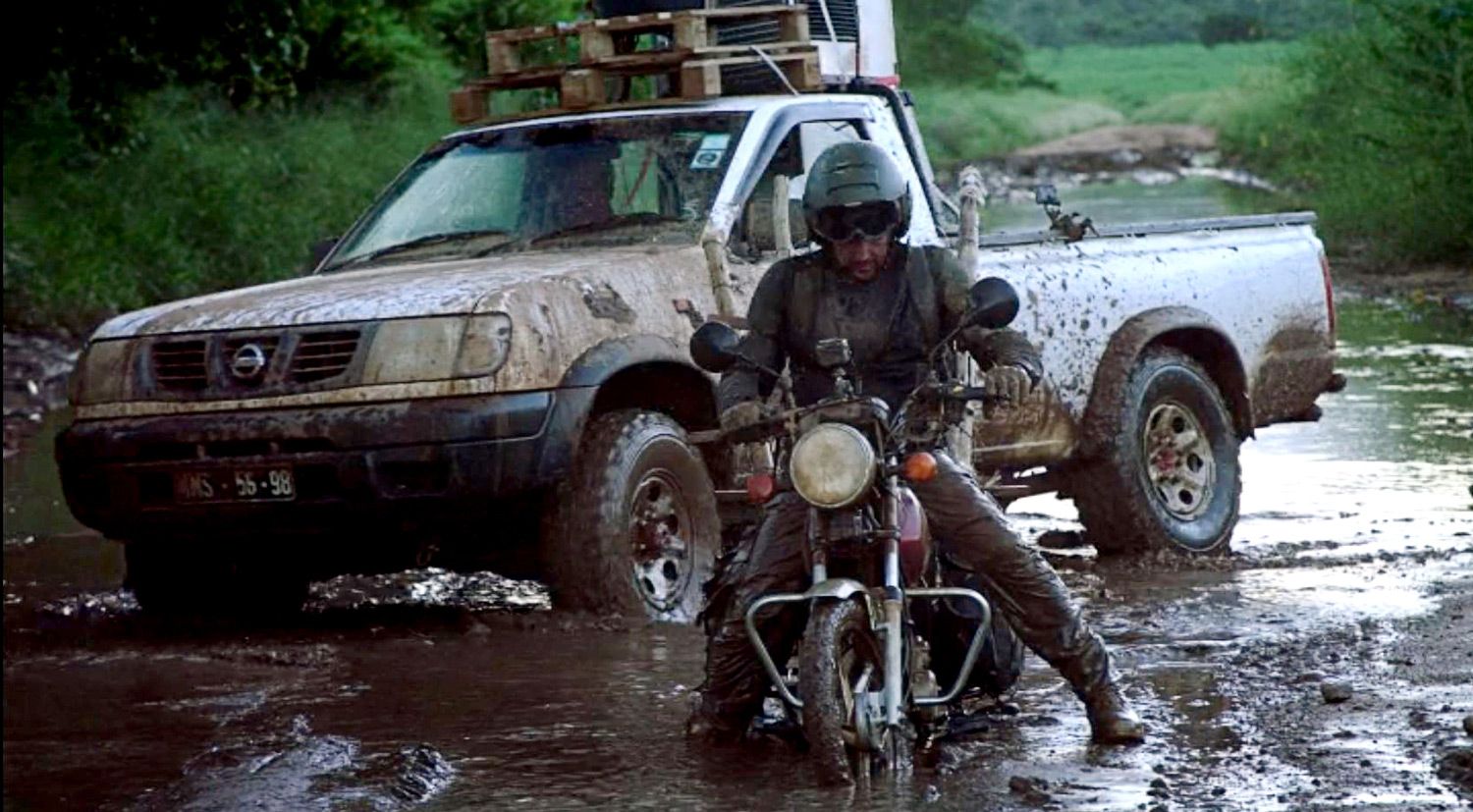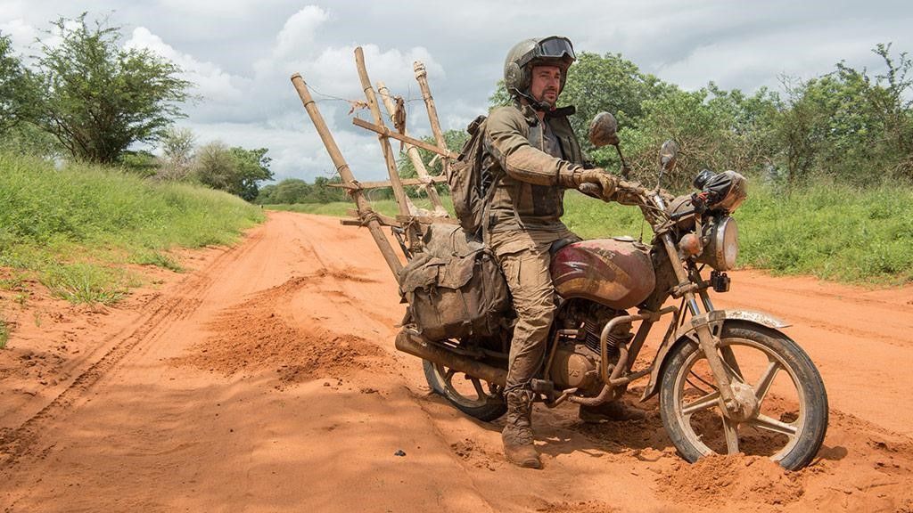 Riding a tiny cargo scooter, Hammond crosses a makeshift wooden bridge suspended over an African river.