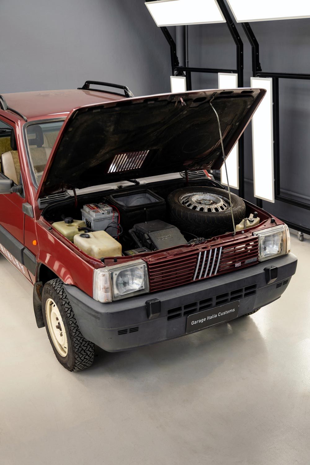 The base is a 1987 Fiat Panda 4x4 Sisley, completely stripped down to the last bolt and brought back to life by Garage Italia Customs.The chassis was treated with protective undercoating and fully repainted in Blue OZ, including every external detail: bumpers, mirrors, trims.