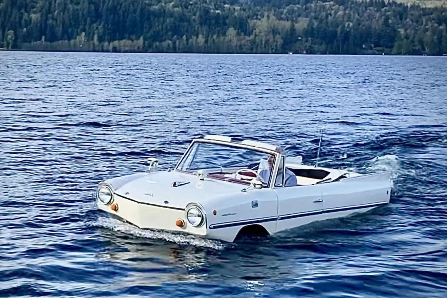 When I wrote “car-boat,” I wasn’t joking.The Amphicar Model 770 is an amphibious car that can drive on the road and also sail on water.