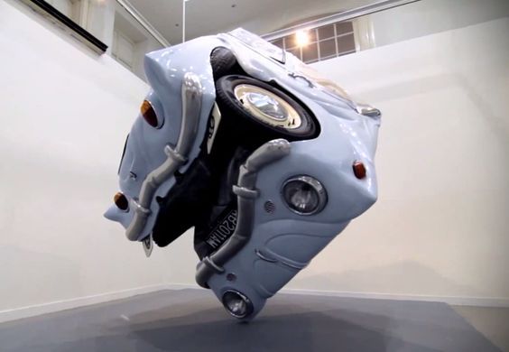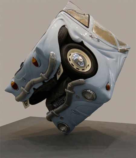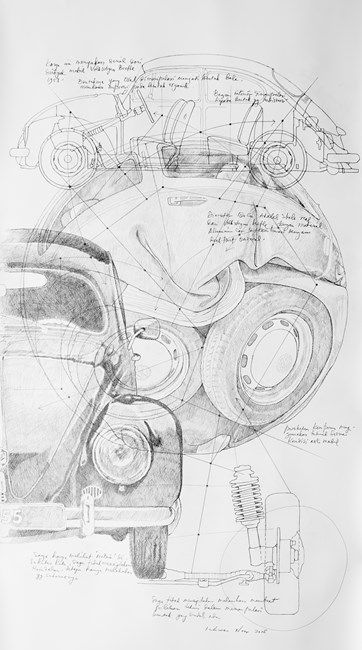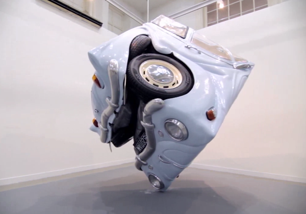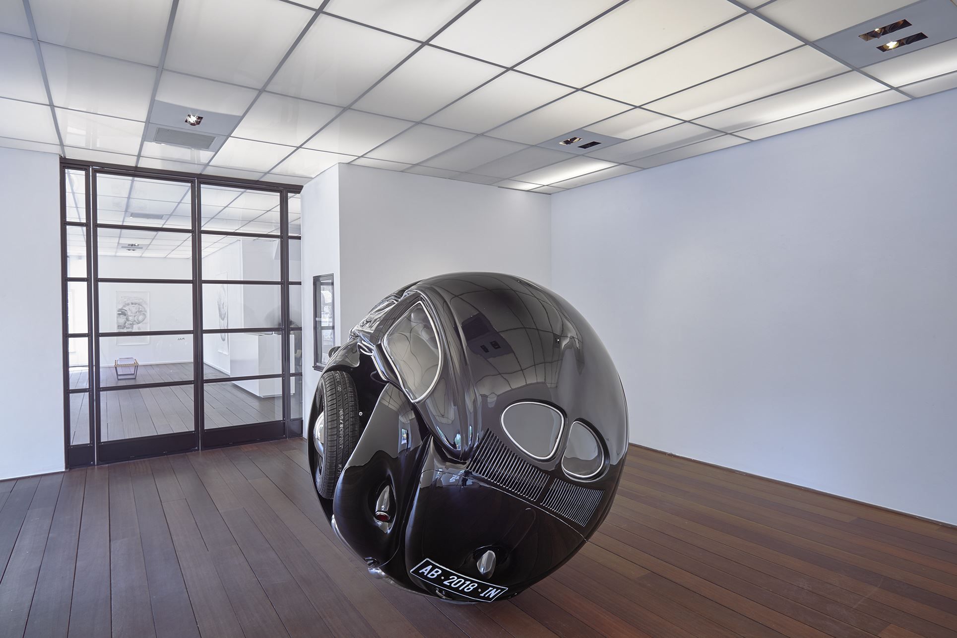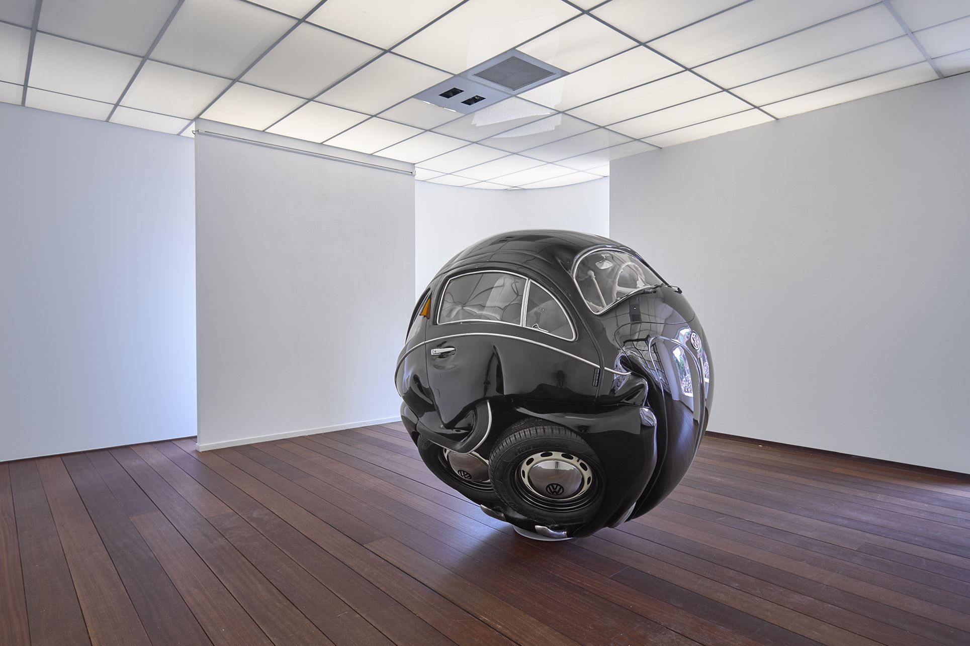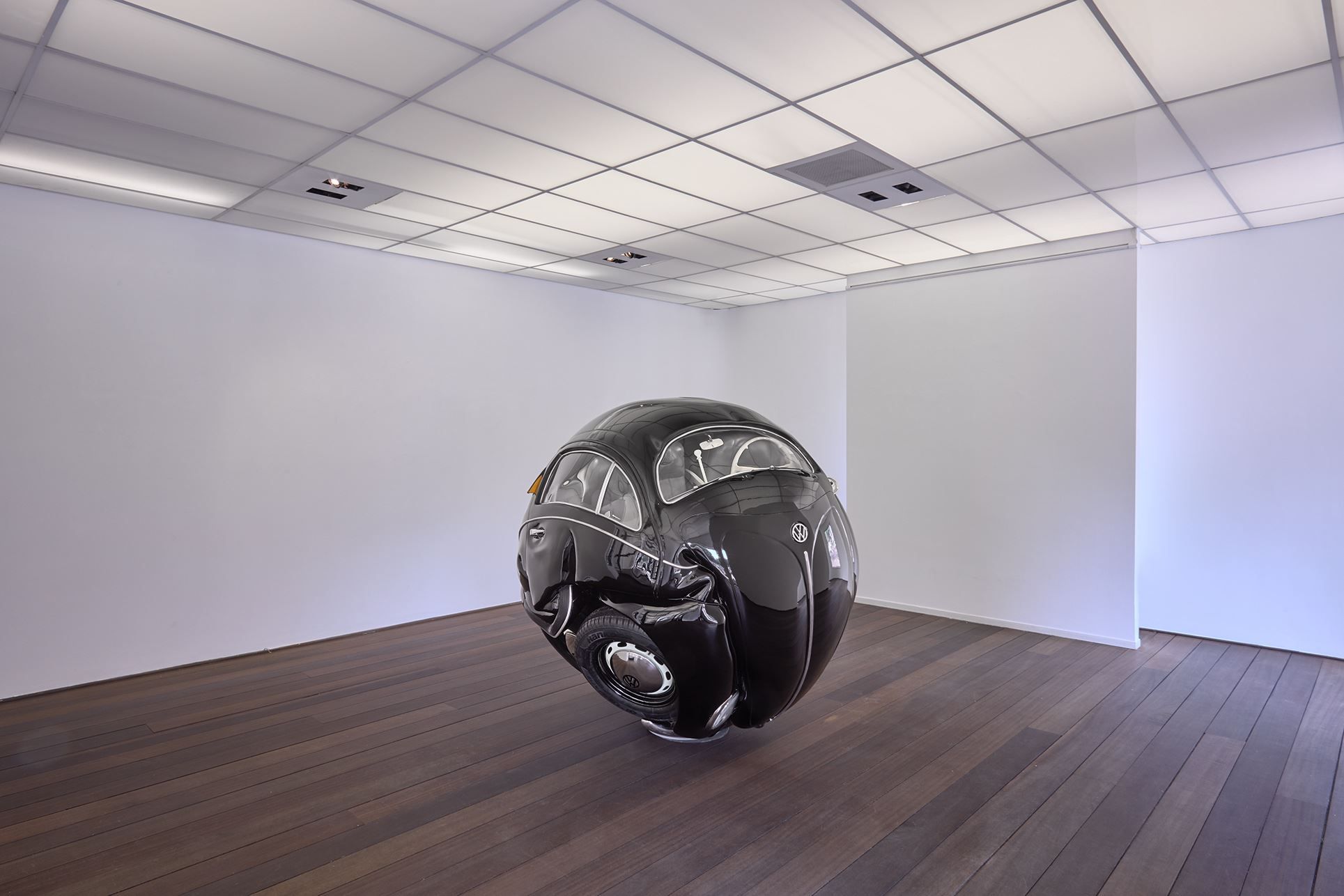 The original design of the car was supposedly based on a sketch by Adolf Hitler, or at any rate it was he who commissioned Porsche to design a car for the average German family that had a fuel consumption of no more than 7 litres per 100 km, was air-cooled, could reach and maintain a speed of 100 km/h for long journeys and cost no more than 1,000 marks. Although it was a big challenge at the time, in 1934 Ferdinand Porsche presented three Beetle prototypes, a cabriolet and two saloons.In 1939, the first Beetle was officially unveiled at the Berlin motor show, which was then mass-produced for the next forty-one years and became one of the most iconic cars ever.Noor's work responds to this rich political history by deforming the object into a sphere composed of original car parts.To avoid the damage he would have incurred if he had started from a real car, Noor sculpted a polyurethane replica of the body and then cast it in aluminium. He then made a separate interior to follow its shape, which was integrated into the exterior of the work.