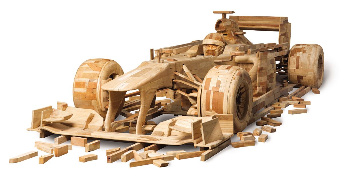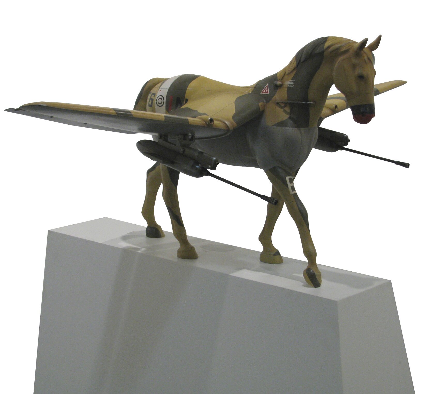 Noor has always explored the theme of transport; moving objects and figures are the focus of his work. For example with Traveller, in 2008, a pair of human legs fused with roller skates, or Playwood, in 2015, a formula one driver inside his all-wood car, and Pegasus, in 2011, a horse with aeroplane wings.These sculptures are the result of the artist's interest in combining the artificial and the natural, projects in which human or animal forms are combined with technological components.