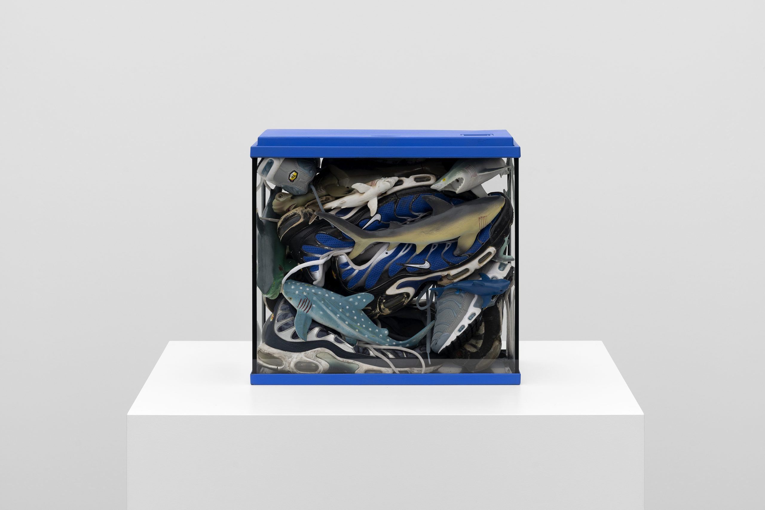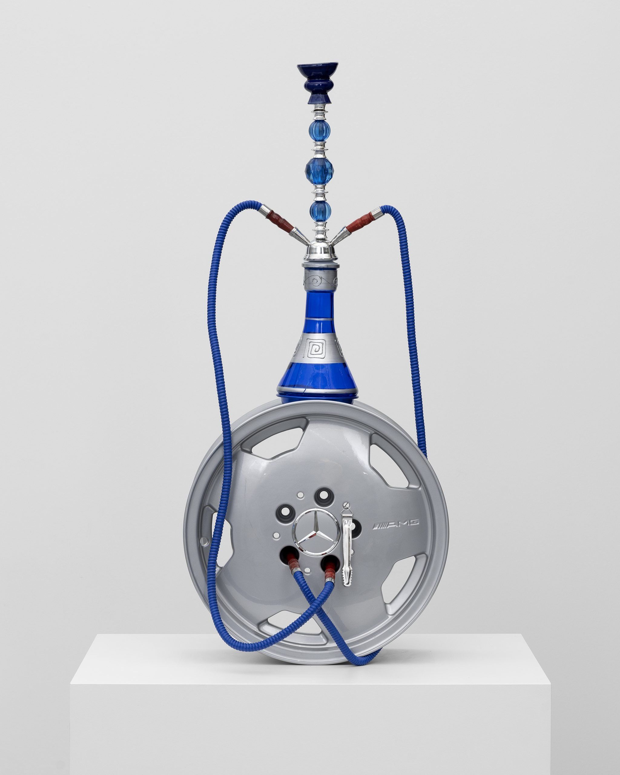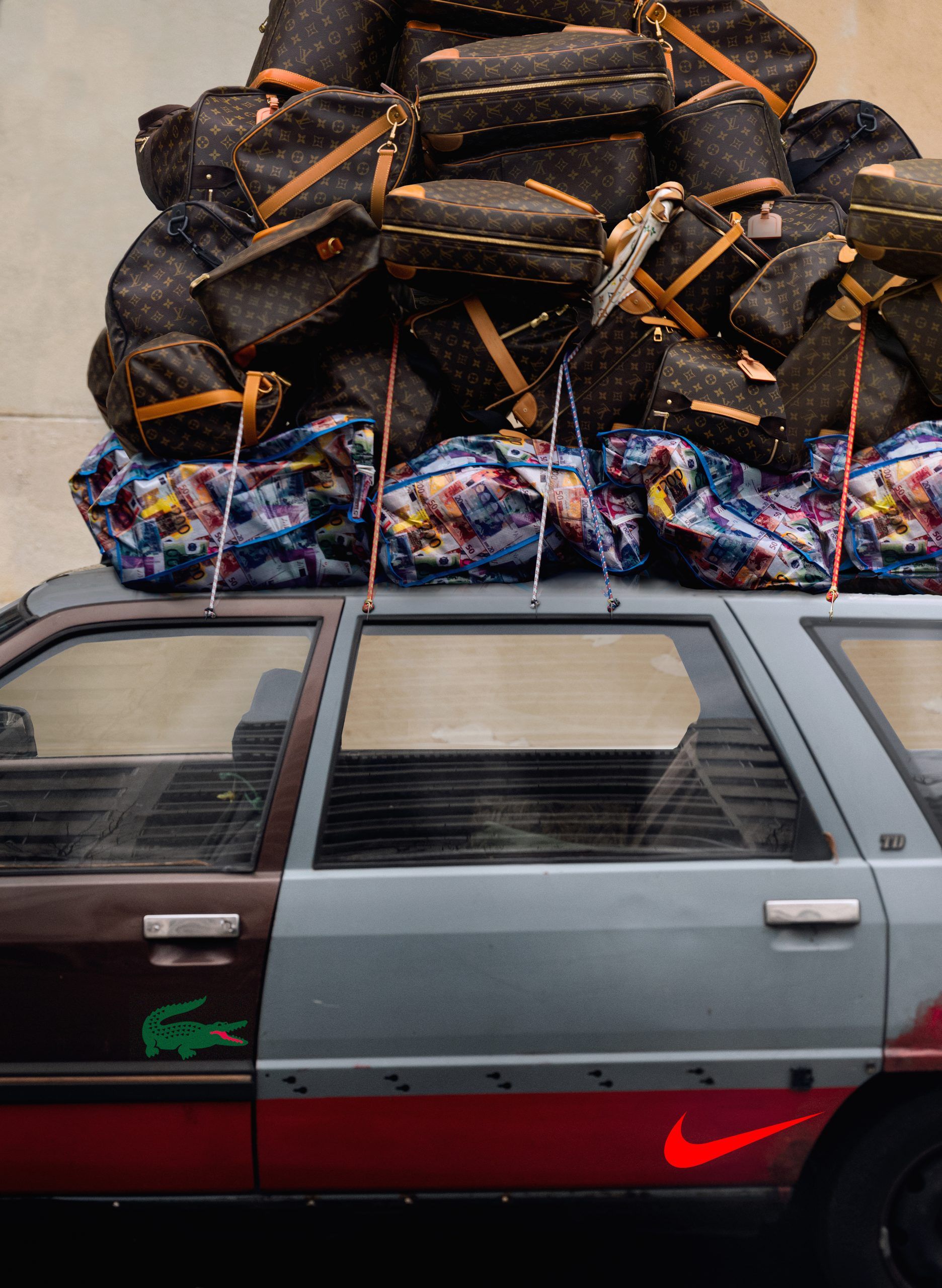 Cresciuto a Sète, città portuale del sud della Francia che segna il collegamento tra la Francia e l’Africa nordoccidentale, l’estetica di Boudet è profondamente influenzata dalla cultura mediterranea. Nella R21 LV Nevada, Boudet immortala queste scene comuni di auto troppo affollate che si preparano per i viaggi di andata e ritorno in barca a ‘le bled’ – un termine arabo usato nei paesi francofoni per indicare il proprio luogo d’origine. Per esemplificare ulteriormente questa sfocatura nelle nozioni di autentico e bootleg, Boudet utilizza delle borse LV autentiche per ricreare una scena comunemente vissuta dalla working class.Altri loghi di marchi come Louis Vuitton, Porsche e BMW sono rivisitati dall’artista come elementi chiave dell’autenticità. Il logo Louis Vuitton, ad esempio, risale al 1896 ed è stato introdotto in parte per allontanare i contraffattori. Paradossalmente, la “L” e la “V” sono i simboli più contraffatti della maison francese. Allo stesso modo, l’artista imita questi simboli di lusso e prestigio nella sua opera Seaux LV.