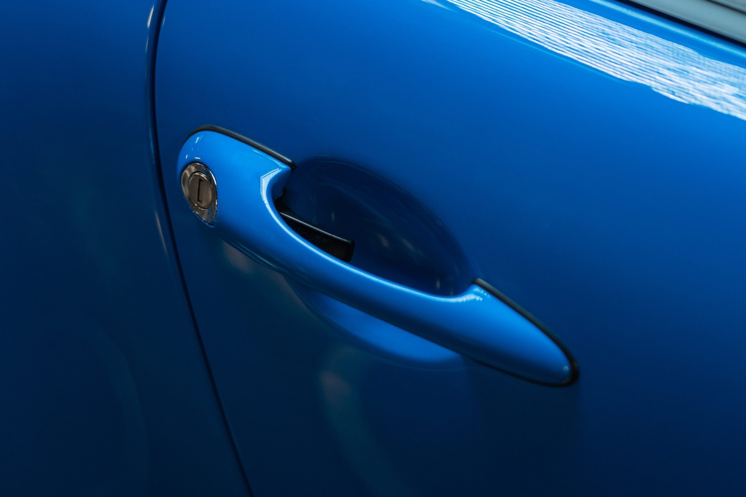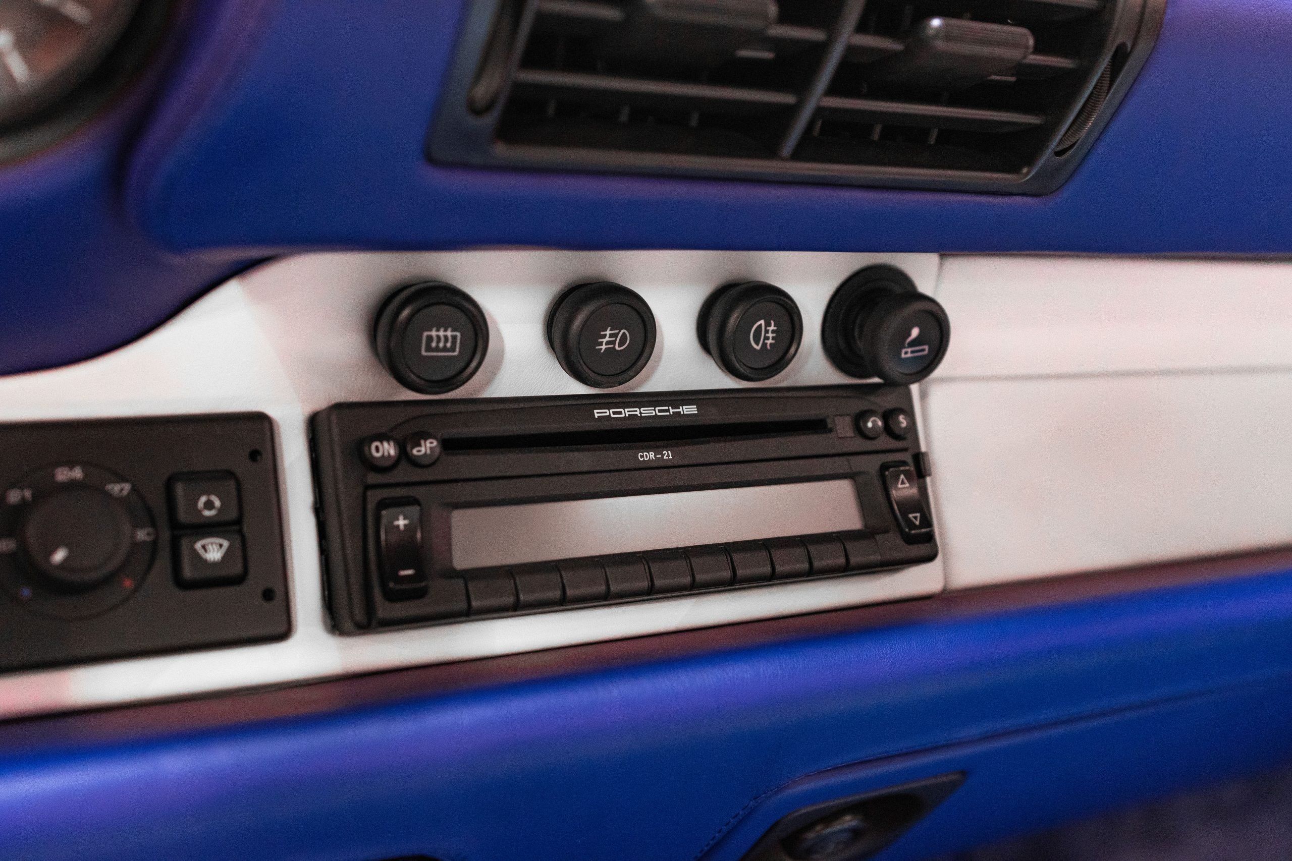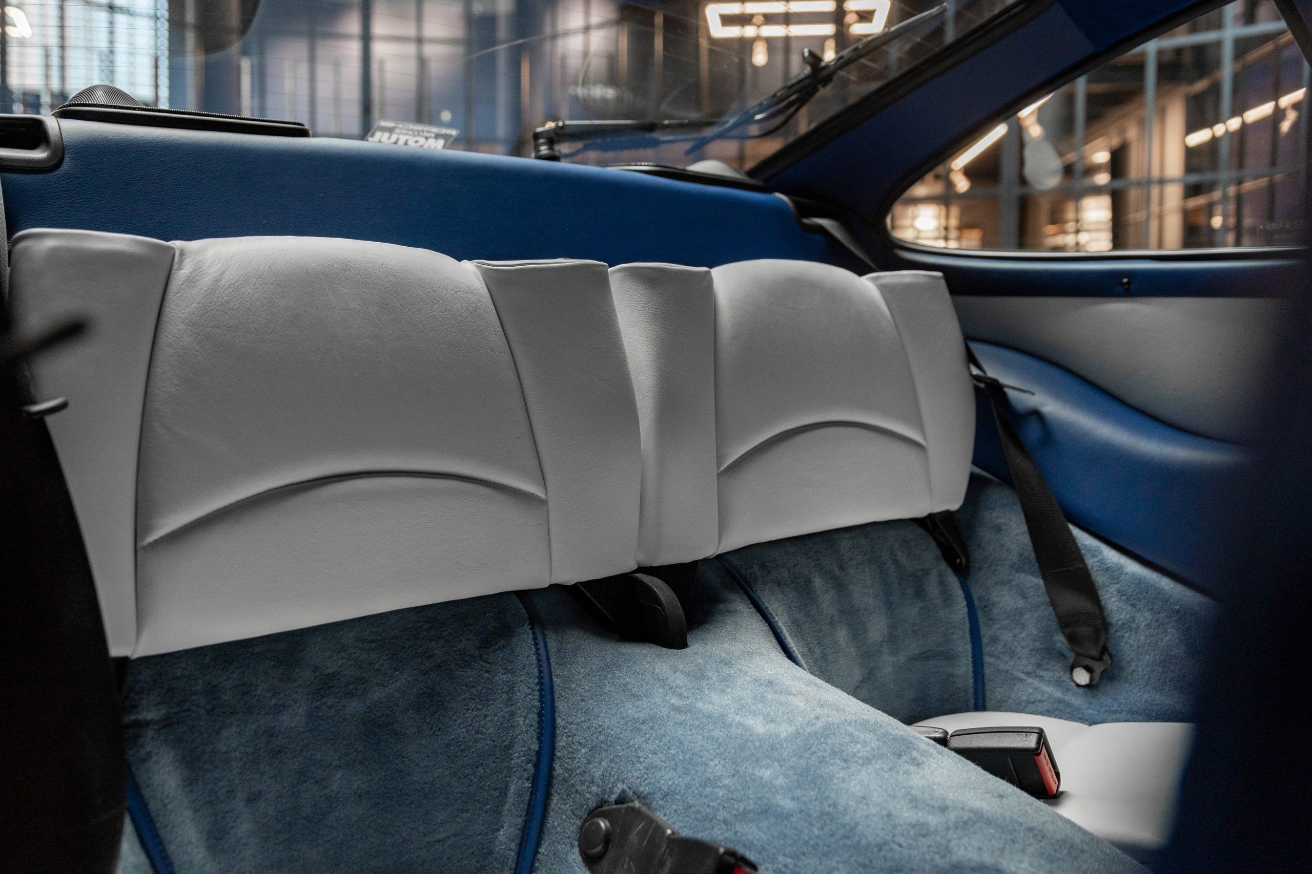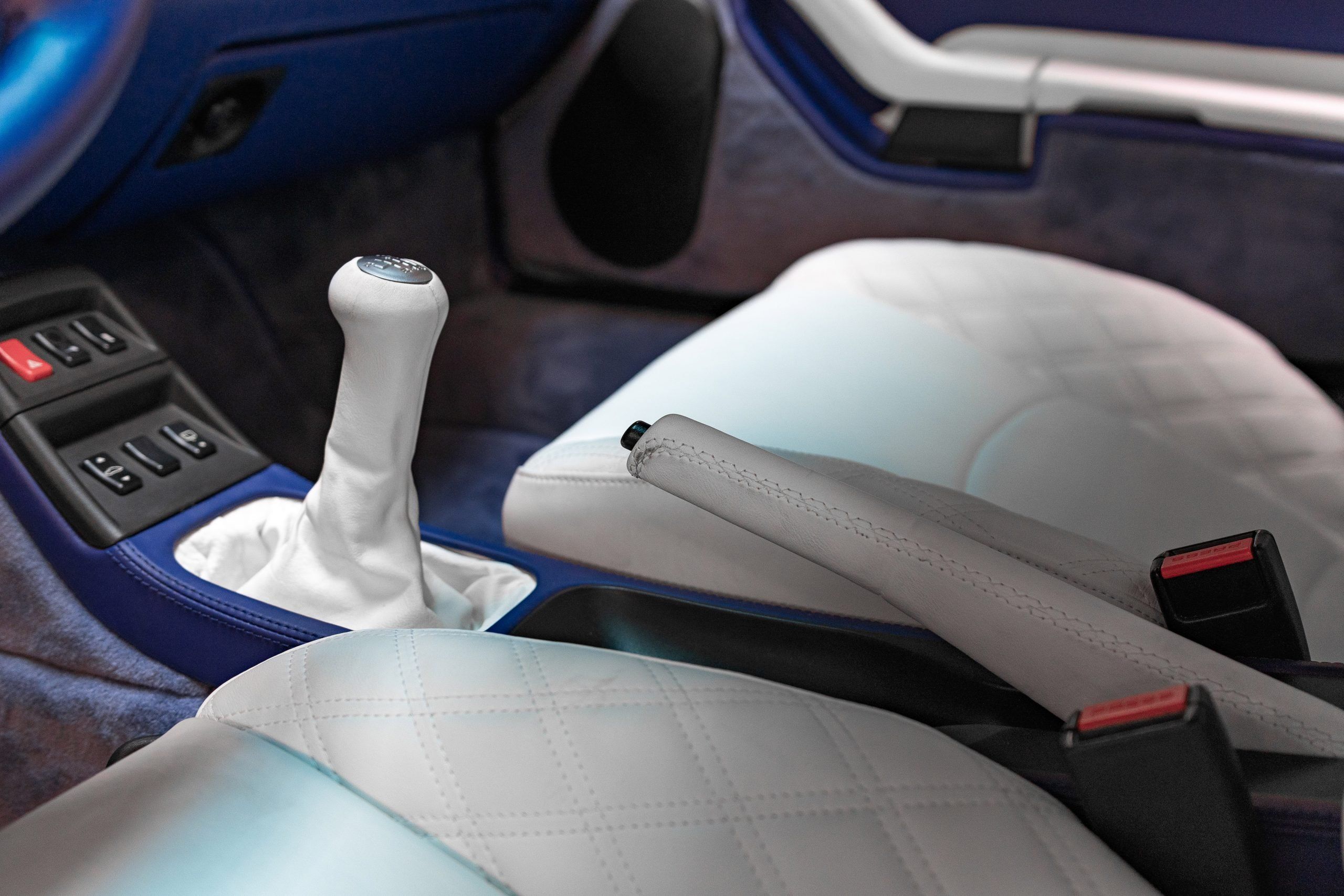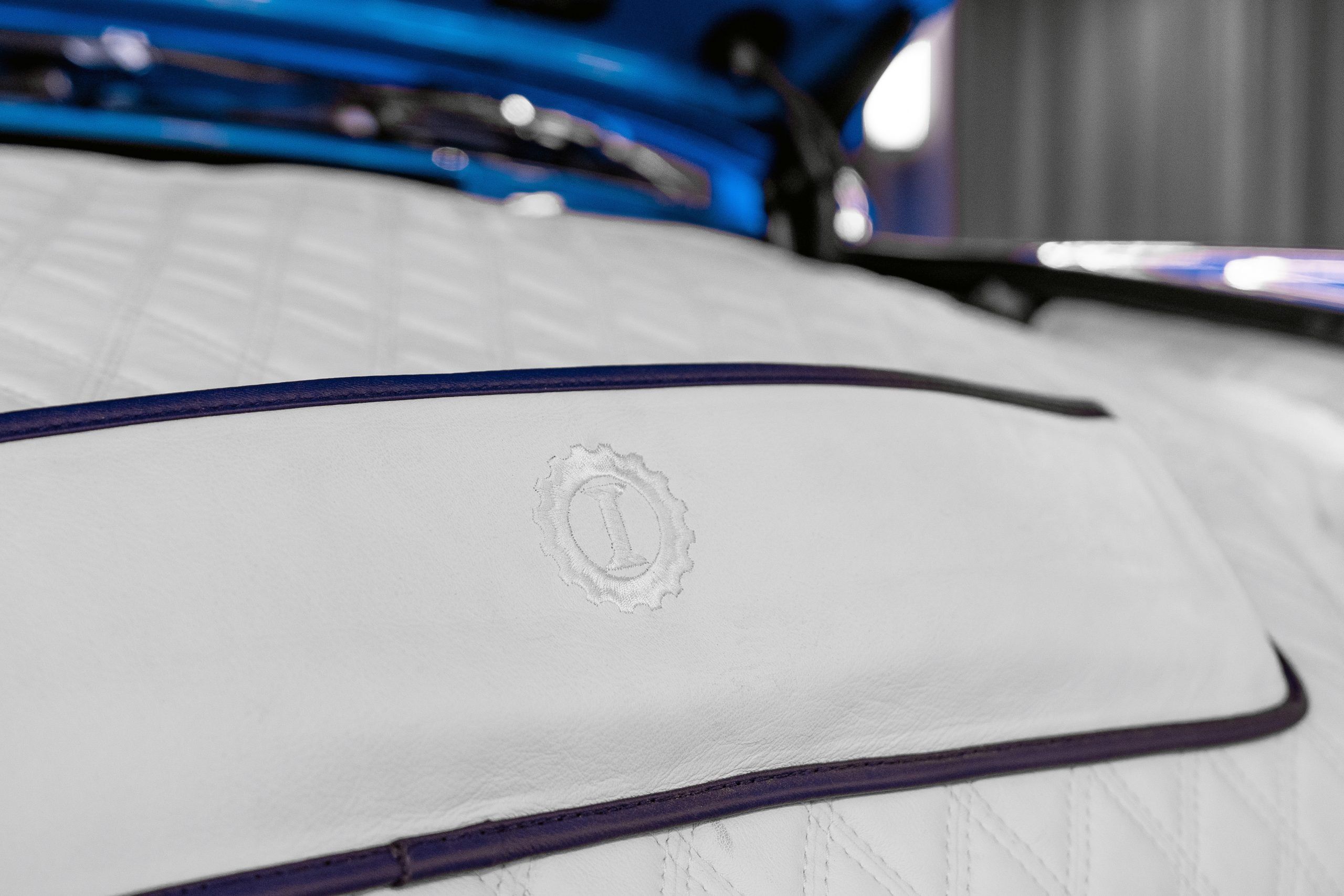 - Premium blue leather re-upholstered dashboard, steering wheel, panels with high contrast white leather details and matching central console, gear stick and sun visors.