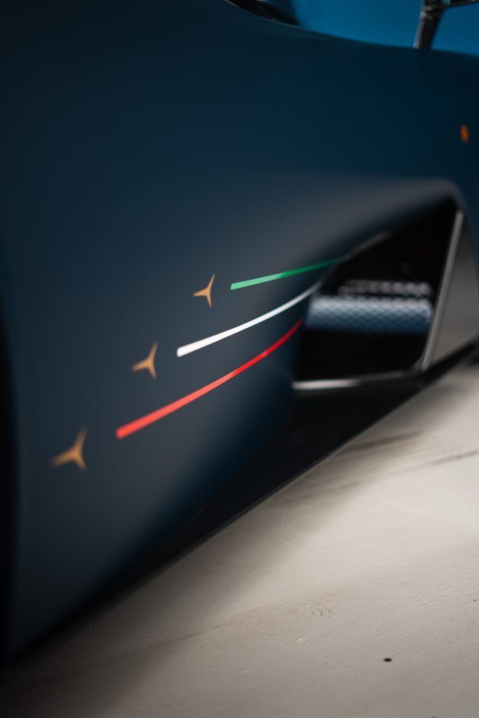 The North American F-86 “Sabre” was the first jet used by the National Aerobatic Patrol, composed of pilots from all departments of the Air Force. This fighter aircraft, described by the Frecce Tricolori pilots as a very maneuverable aircraft, by the way it required great skill of the pilots. In 1963, following an update of the fleet, the Frecce Tricolori patrol was equipped, in replacement of the previous F-86E Sabre, with the G.91 aircraft, suitably modified, depriving them of the war equipment and equipped with smoke generator. In this configuration they acquired the official designation G.91PAN (National Acrobatic Patrol) with the characteristic blue livery enriched by three red-white-green arrows on the sides of the fuselage, inherited from Sabre. Does it look familiar? Some of you will remember the special edition of Zonda Cinque prepared by Pagani in 2010 on the occasion of the 50th anniversary of the Frecce Tricolori. The Zonda Tricolore was characterized by the blue livery with tricolor bands, which recalls the one of PAN’s aircrafts MB-339. Ten years later, on the occasion of the 60th anniversary of the world’s largest aerobatic team – 10 aircraft, 9 of which were in formation and one soloist – we proposed to one of our customers to customize his Dallara Stradale with a livery tribute to the iconic G.91 of the National Aerobatic Patrol that remained in service until 1982.