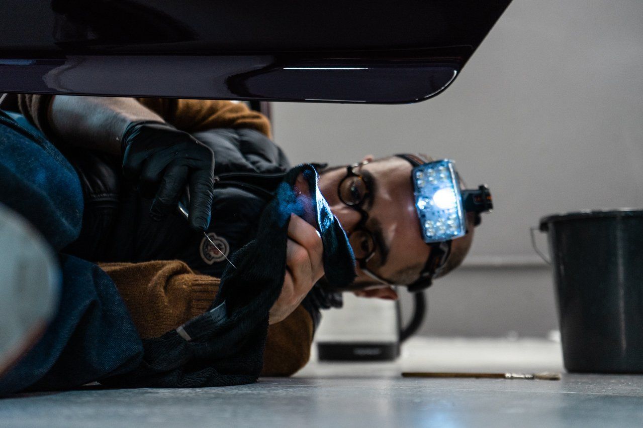 Giorno 1L’auto arriva in una mattina di pioggia, quindi d’istinto penso subito ad asciugarla, ma prima vaporizzo l’intera carrozzeria con abbondante acqua demineralizzata e un po’di detergente colloidale, giusto per dare un po’ di viscosità e rendere più facile l’asciugatura. Ho un carrello di microfibre pronto a fare il loro dovere: grandi per togliere il “grosso”, piccole e morbida per rifinire, nere per i cerchi, gialle per le parti inferiori dell’auto.Due ore dopo, l’auto è pronta per la lavorazione.Ora posso rendermi conto della reale condizione delle superfici dell’auto.MAI fare una valutazione delle condizioni estetiche con l’auto sporca!La giornata continua con l’aspirazione degli interni e il lavaggio delle parti in moquette, con il profumo di detergente tedesco al fiele di bue che mi inebria i condotti nasali.