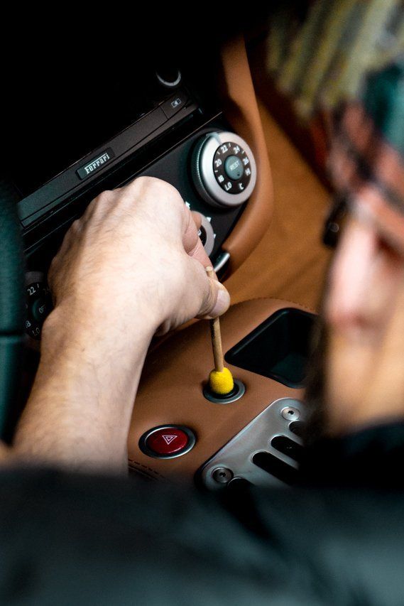 Giorno 4Arrivo, tolgo la copertura all’auto, vado a farmi un caffè.Tornando verso l’auto la guardo, ho un momento di sorpresa: vederla da lontano mi fa capire che il detailing sta prendendo forma, e la carrozzeria pulita nei minimi particolari appare compatta e uniforme. Bene, porte aperte, sedili reclinati e pulizia della pelle, naturalmente a spazzola inglese e detergente per la pelle dell’abitacolo. Dato che in una Ferrari il 99% dell’abitacolo è rivestito di pelle, il lavoro dura una giornata.