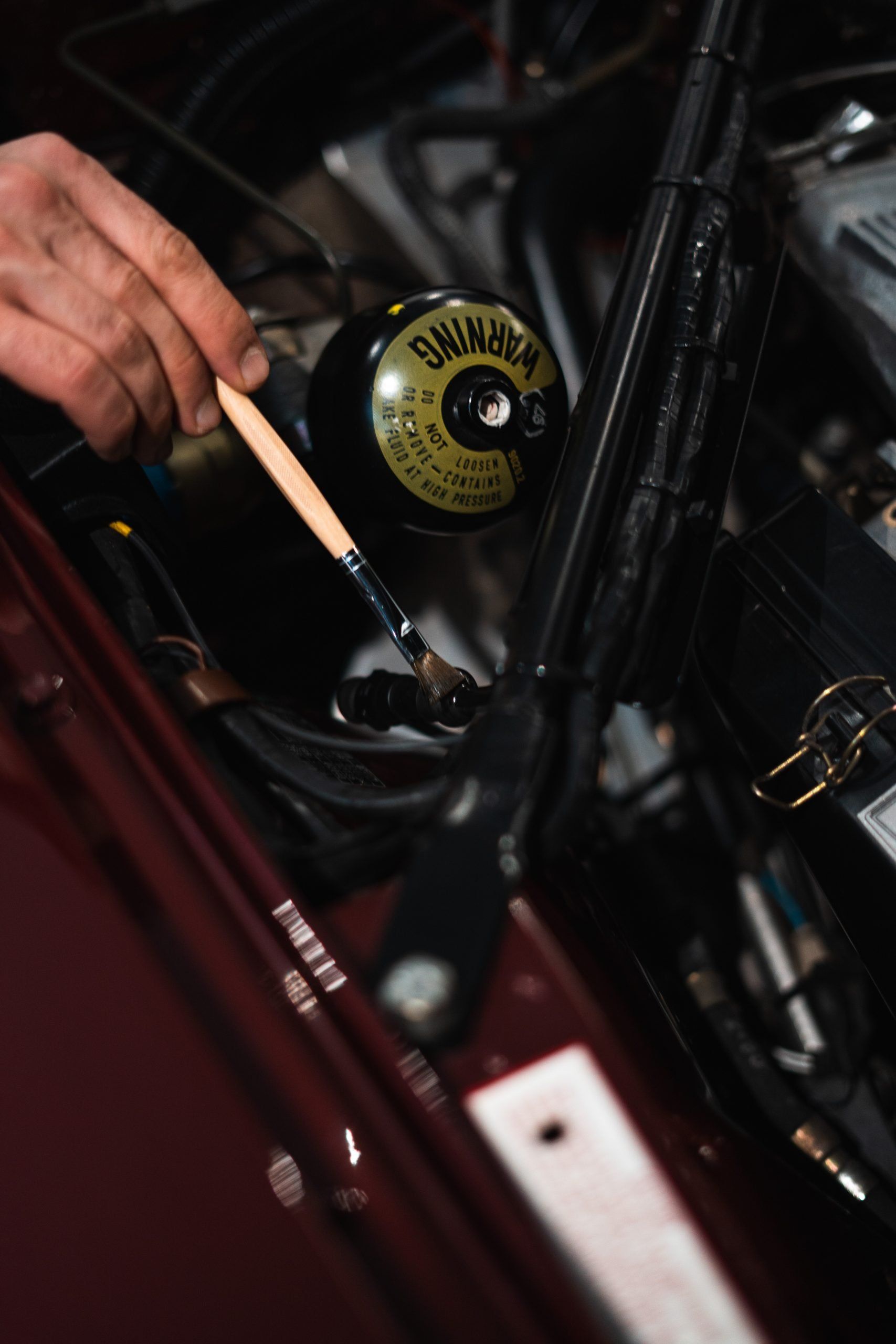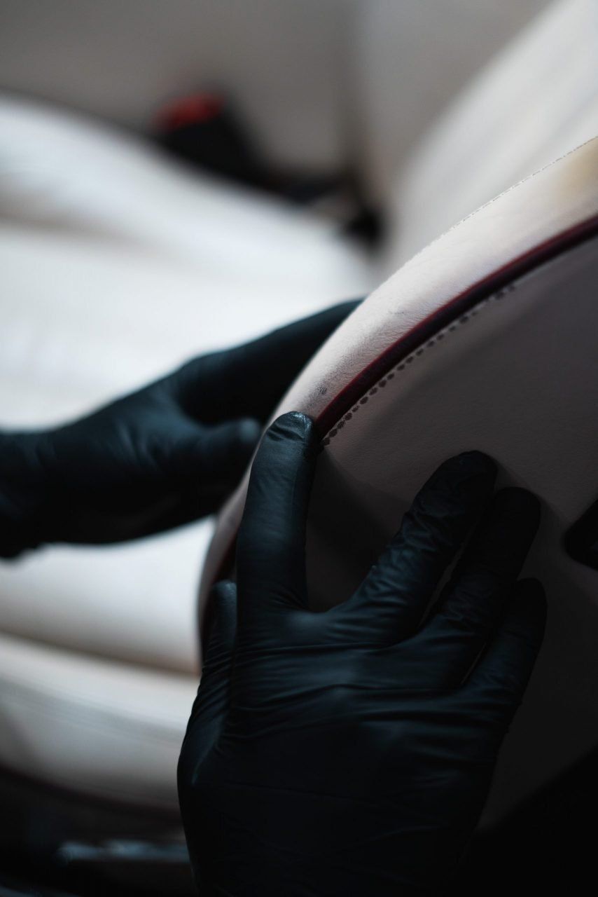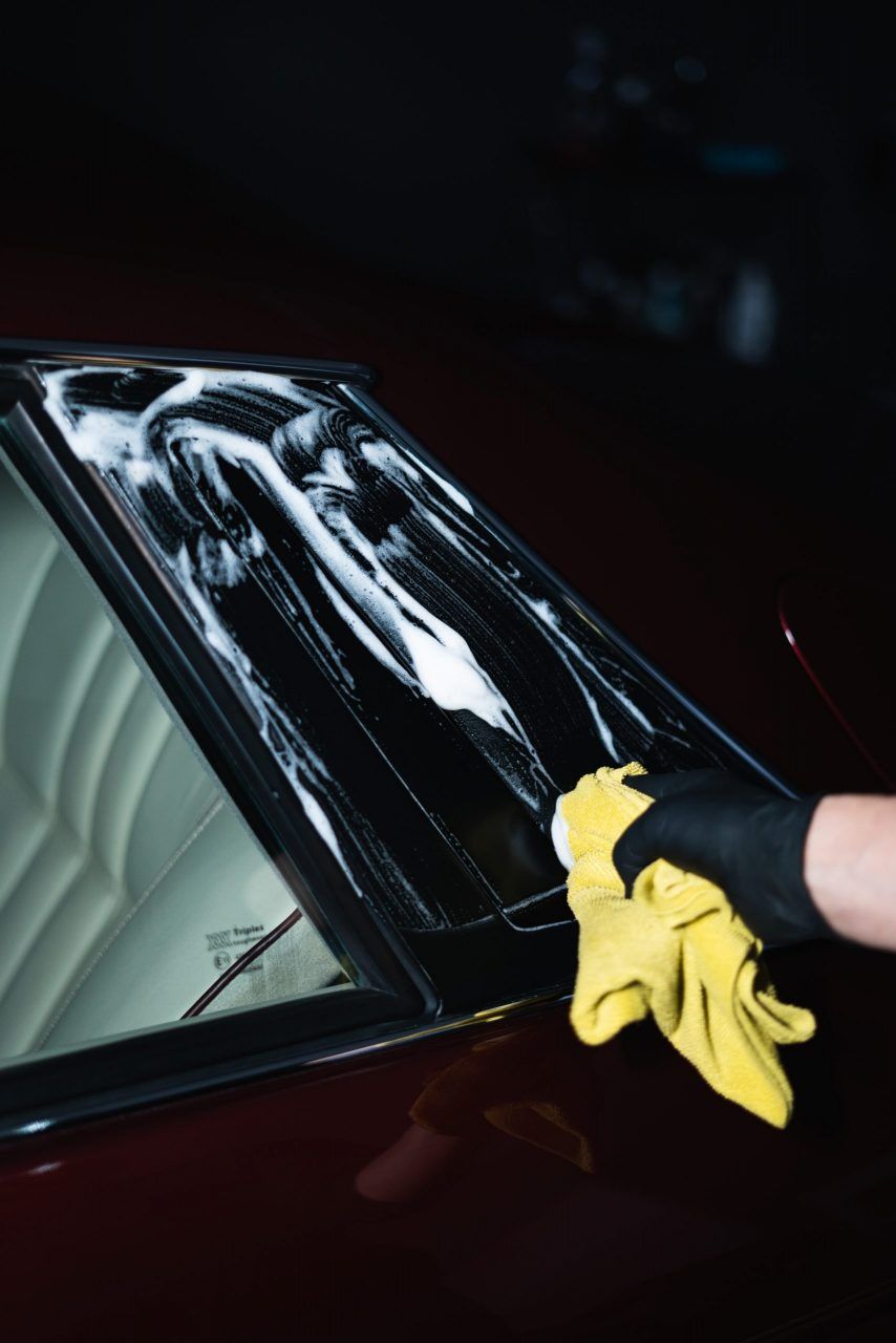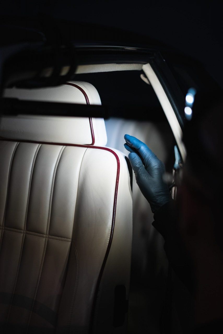 Giorno 6Oggi devo finire l’abitacolo. Preparo una soluzione schiumogena leggerissima e inizio a pulire la Connolly; pulisco senza spazzola utilizzando solo il palmo della mia mano, la pelle ha già una trentina di anni, meglio non stuzzicarla con setole dure e aggressive. Il piping bordeaux che contrasta col “cream” dei sedili è scolorito nella parte laterale esterna per via dello sfregamento e della conformazione sportiva del sedile. La cosa più scontata sarebbe riverniciare, ma scelgo un restauro più conservativo a base di grasso riscaldato che riproduce il colore scuro del piping.