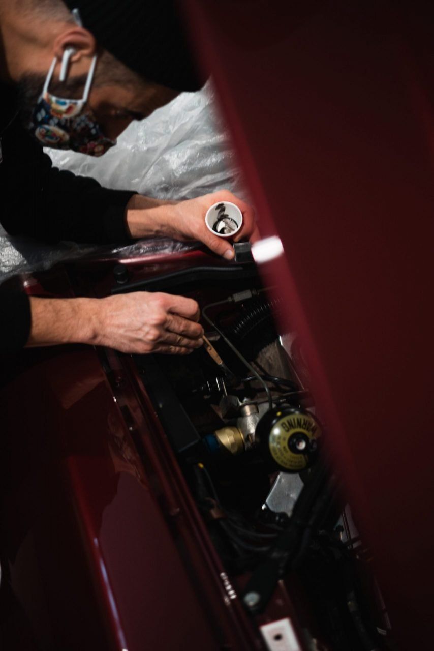 Giorno 1Un’auto atipica necessita di un approccio atipico.La parte che attrae subito le mie attenzioni maniacali è il vano motore. Il proprietario mi racconta che recentemente il tappo del radiatore è saltato e l’acqua è finita ovunque. Ci sono macchie di calcare, polvere decennale, grasso e olio sbavati ovunque. Luce in testa, acqua calda e pazienza a piene mani, e la prima giornata è dedicata alla pulizia del vano. La mia vista è ai minimi storici. Gosh!