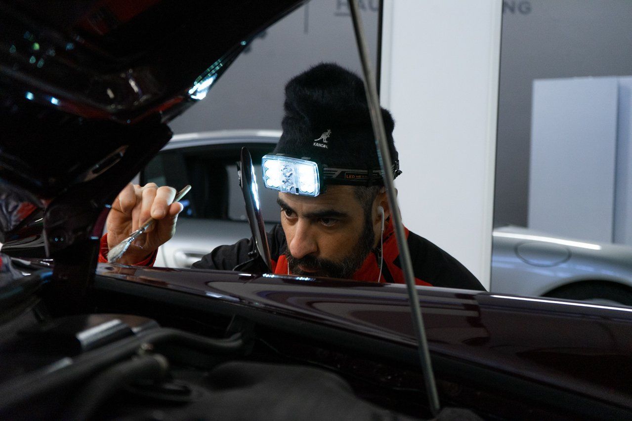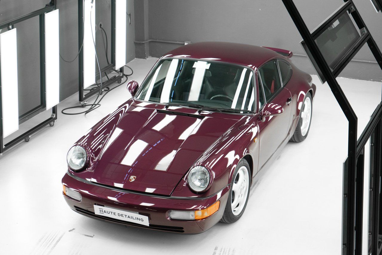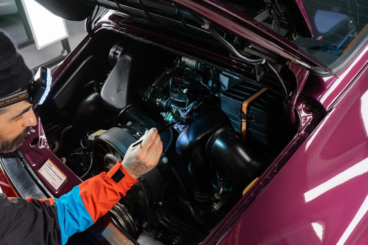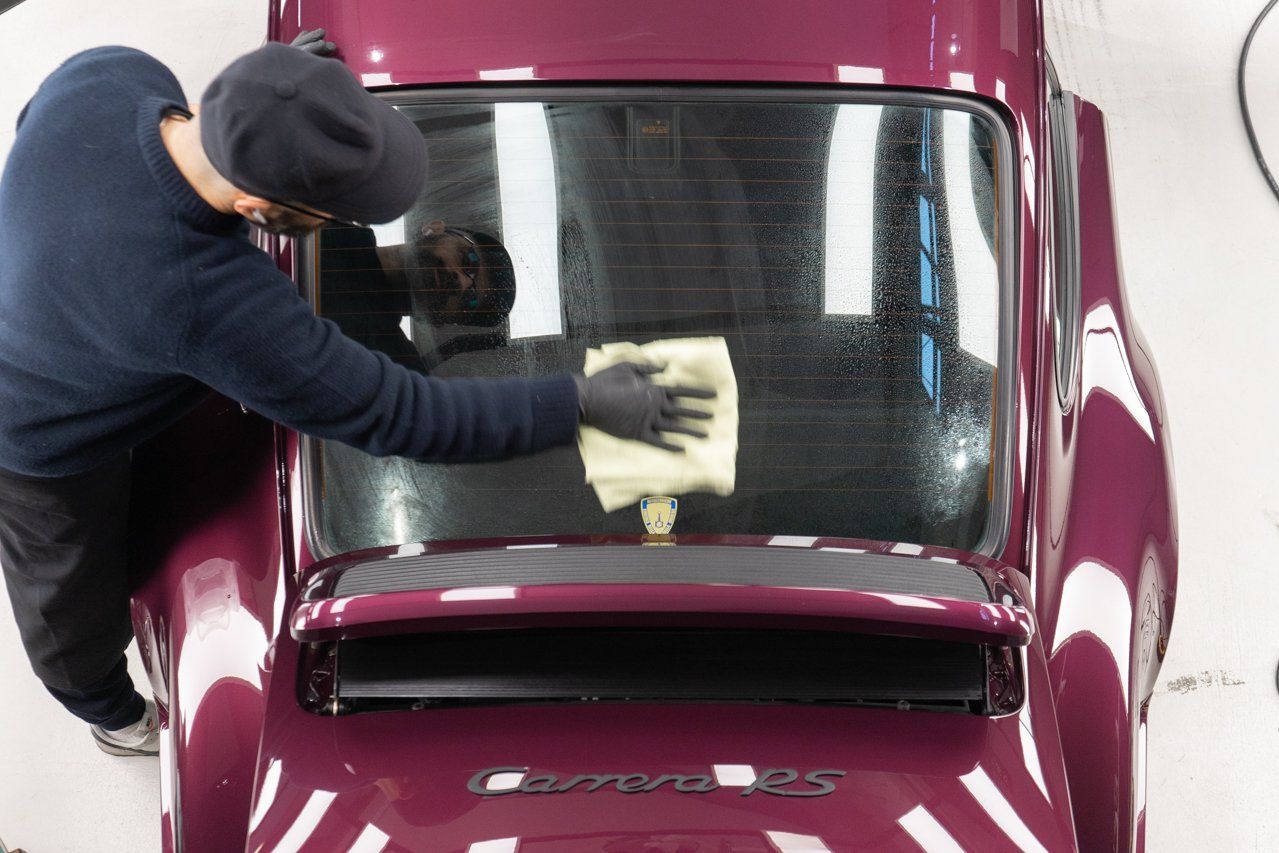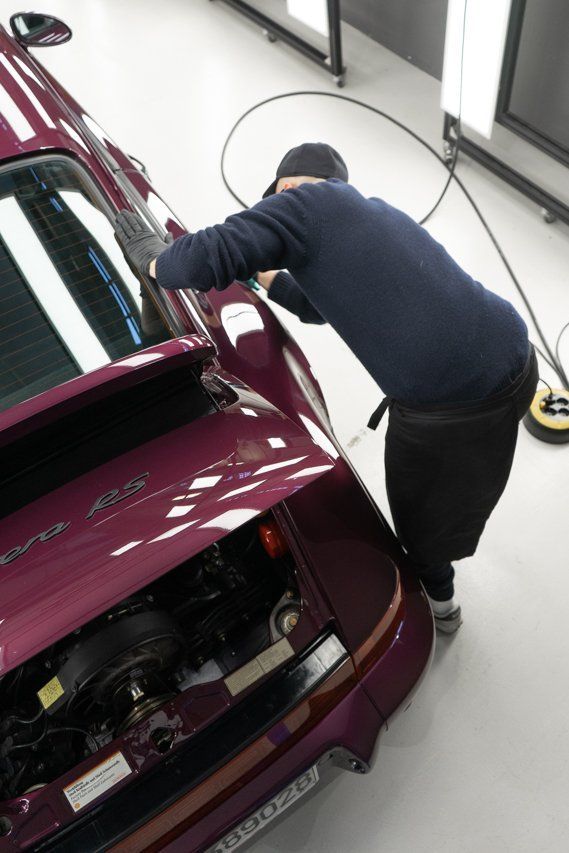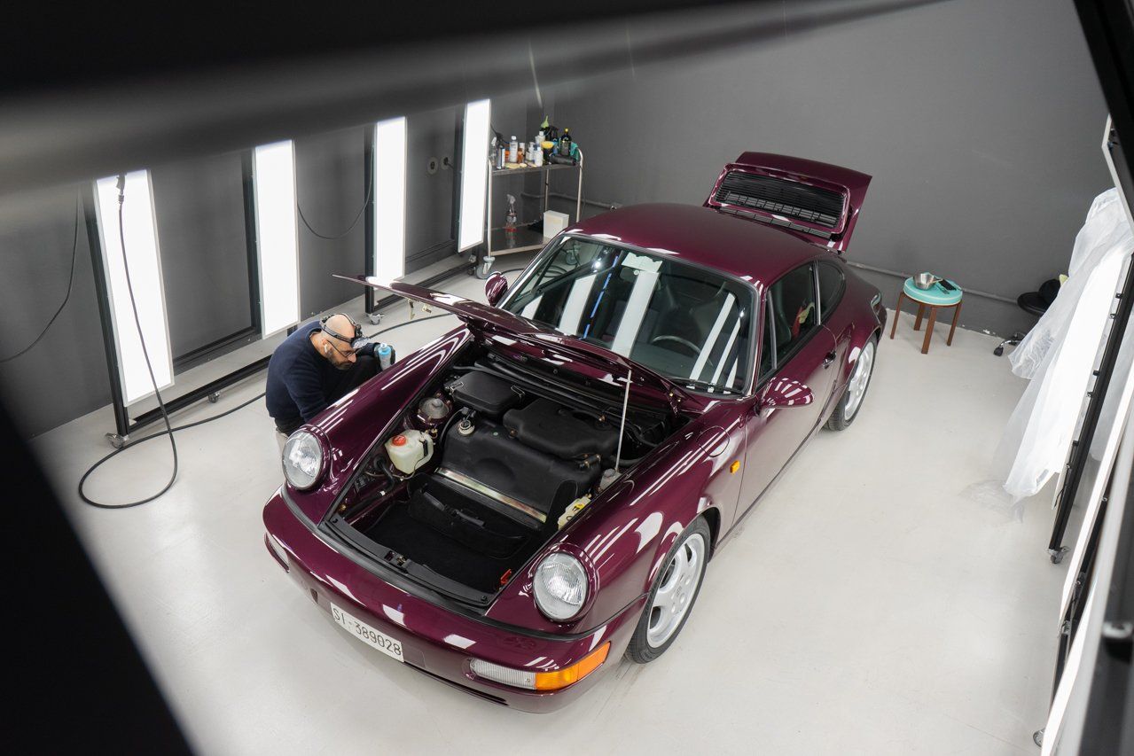 Giorno 1Il primo giorno è dedicato al lavaggio dell’auto, che qui chiamiamo aesthetic bath: non un semplice lavaggio, ma un lungo trattamento di bellezza per preparare l’auto alla lucidatura e al detailing vero e proprio. E devo dire che farlo su questa Porsche è un piacere. L’acqua demineralizza mista al detergente colloidale forma una miriade di goccioline che riflettono la luce e bellissimi riflessi ametista. Lascio agire e inizio a rimuovere con le microfibre, soffiando via l’acqua dalle giunture, che per le auto classiche è importantissimo.La mattina passa velocemente tra spatole e microfibre.Il pomeriggio decido di iniziare a nastrare per proteggere arie, spigoli e guarnizioni.
