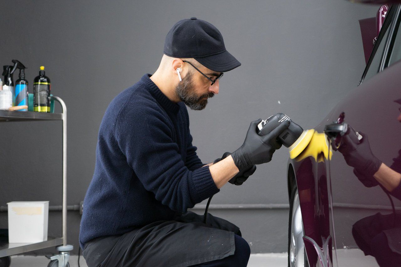 Giorno 2La sera prima ho posizionato l’auto in sala di lucidatura, ora preparo il carrello per iniziare il lavoro. L’auto non è molto grande, ma tiro fuori tamponi e lucidatrici di ogni dimensione. Cercherò di lavorare di taglio e finitura in maniera contemporanea, questo mi aiuta ad avere più controllo sulla la situazione finale (potrei dimenticare un graffio, mon-dieu!).Inizio dal fianco destro dell’auto, sistemo le luci per vedere i difetti e inizio a decontaminare la parte con un prodotto a base vegetale che rende il lavoro facile e atossico (I love it). Voglio che questa superficie ametista torni allo splendore originale!