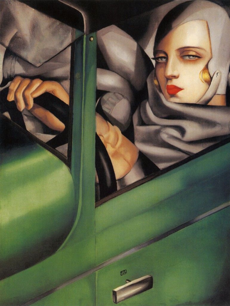 Bugatti tipo 43Parlando di opere ispirate da automobili non si può non citare l’autoritratto con cui la pittrice Tamara de Lempicka si immortalò a bordo di una lussuosa Bugatti verde smeraldo.Di sicuro la macchina ha ispirato una delle pittrici più iconiche del secolo scorso, ma l’hanno fatto anche il periodo storico, l’inizio degli anni venti, e il tema dell’indipendenza femminile. Al volante c’è una donna bionda, lei, con i capelli a caschetto e guanti in pelle di daino, che guida da sola la sua auto, una meravigliosa Bugatti Tipo 43, sicura di sé e senza il timore di guardare il resto del mondo dritto negli occhi. L’artista sceglie di rappresentare un nuovo tipo di femminilità, ricca, emancipata, raffinata e soprattutto con gusti sopraffini per quanto riguarda la scelta delle automobili.