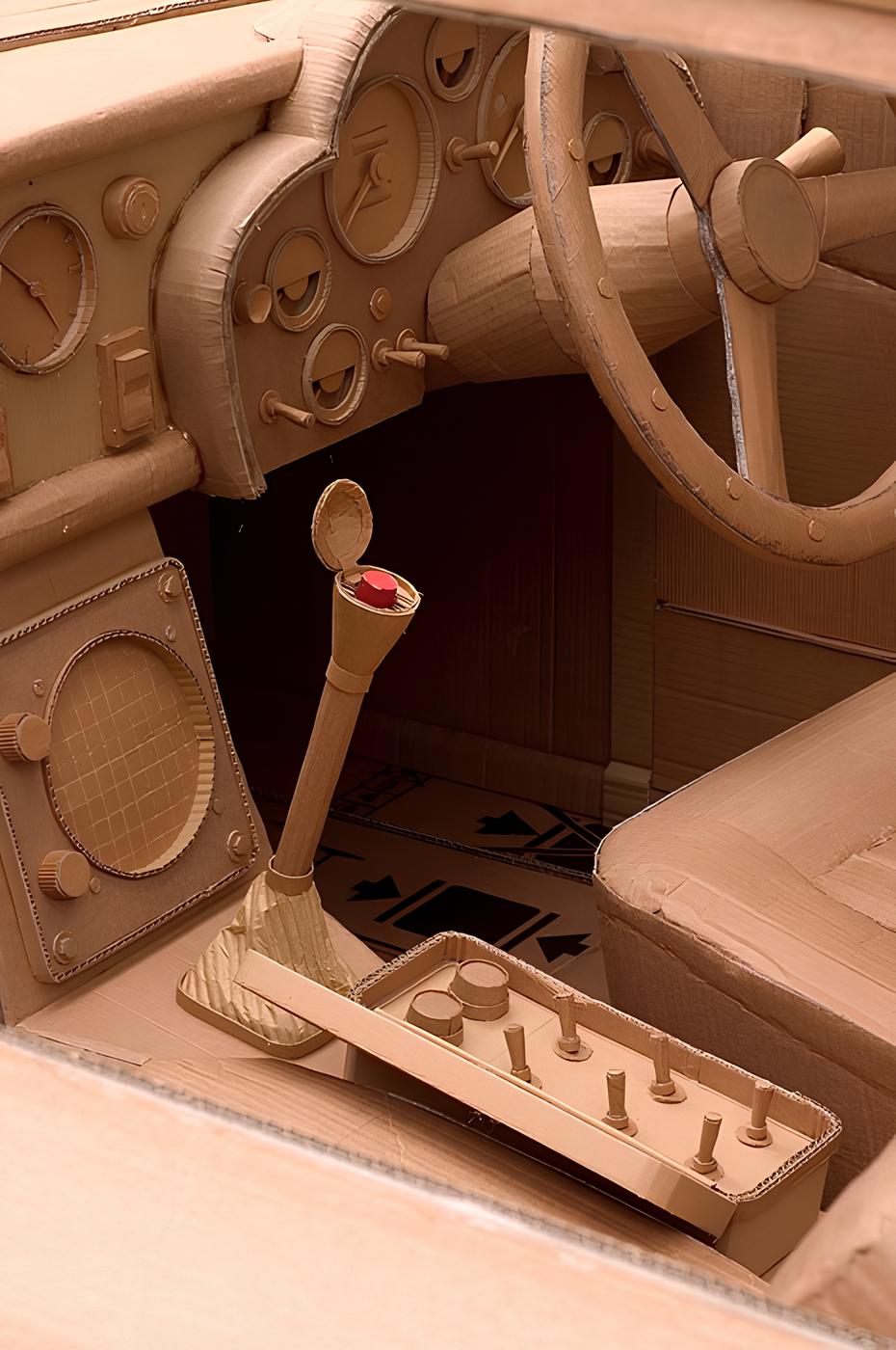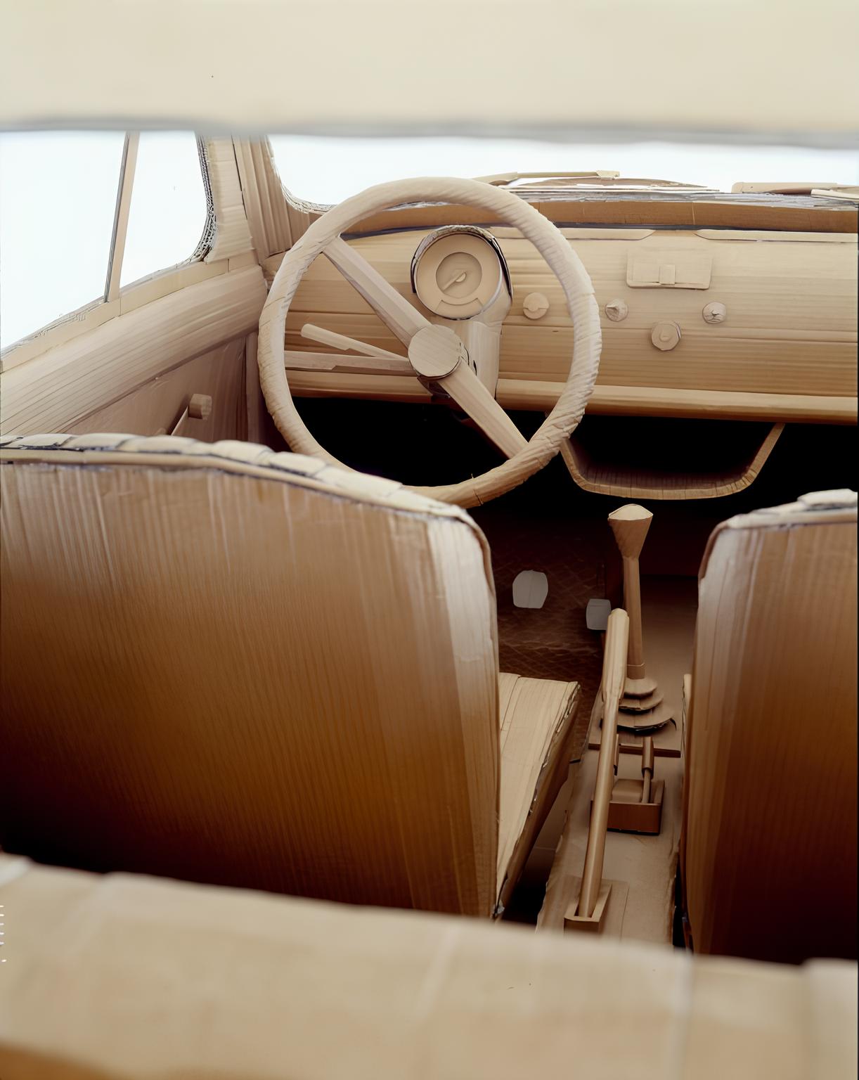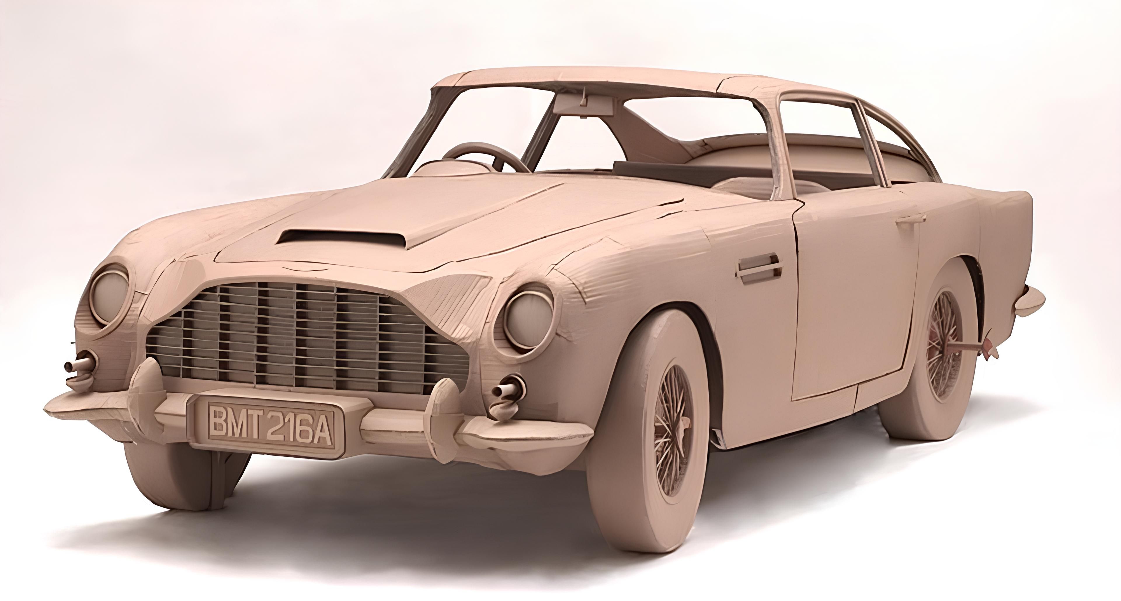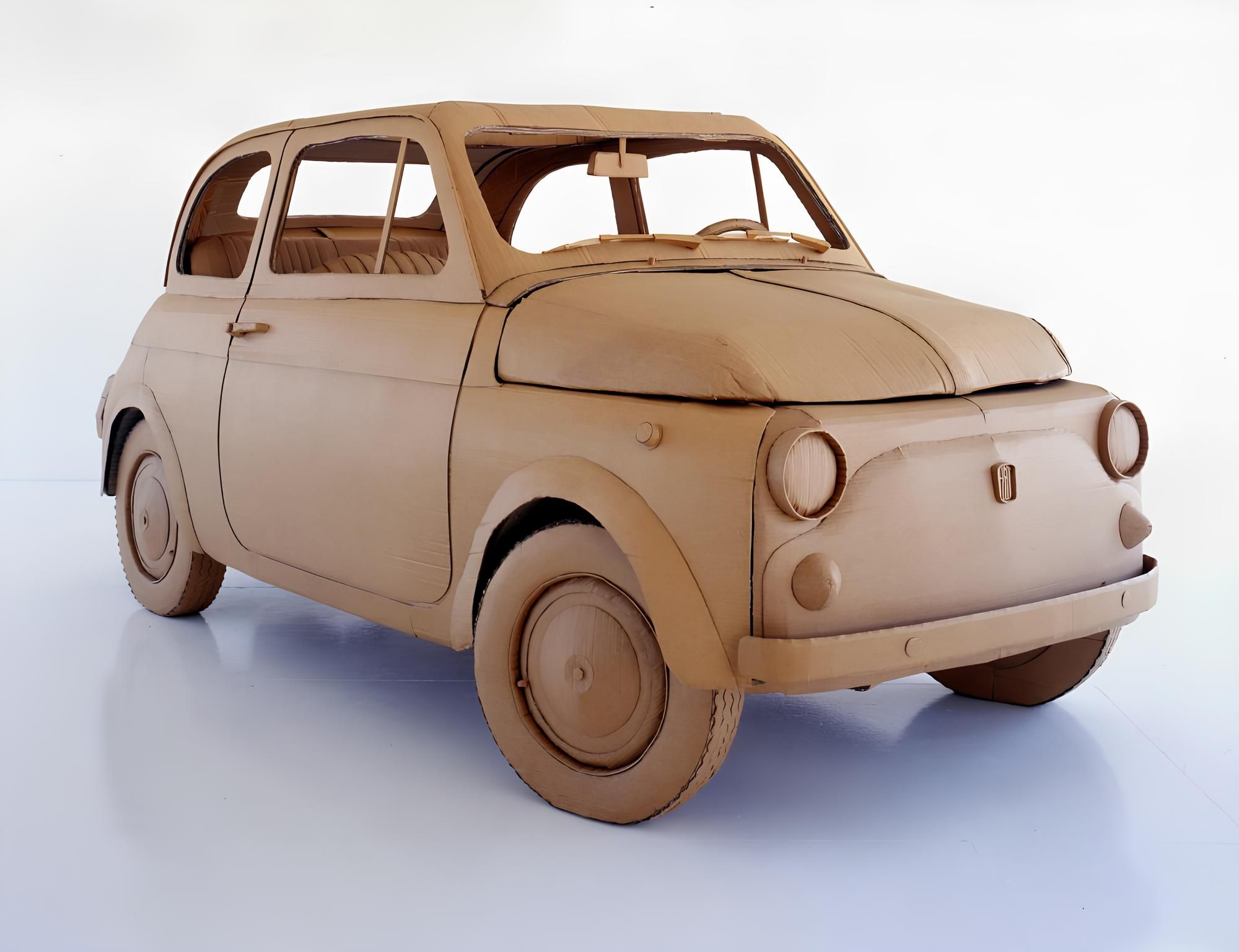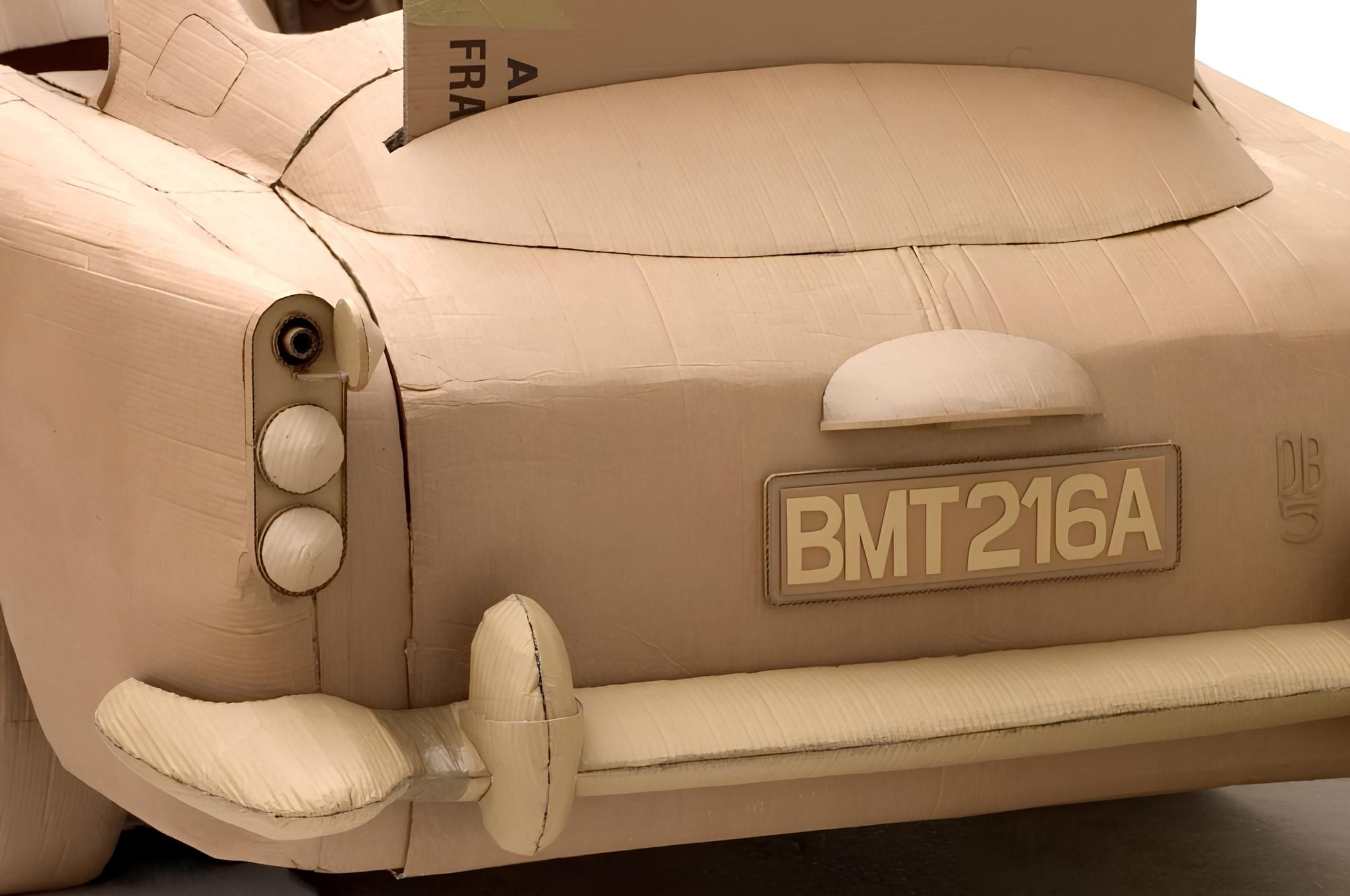 Aston Martin DB5 (e di nuovo Fiat 500)Uno scultore inglese, Chris Gilmour, che ha come tratto distintivo il rappresentare oggetti di vita quotidiana in scala uno a uno, è stato ispirato dalla Aston Martin DB5.Usa cartone riciclato assemblato con la colla ed è maniacale nella riproduzione dei dettagli, anche interni, delle sue opere su ruote.Dico opere al plurale perché la Aston Martin non è l’unica auto che lo ha ispirato.La nostra 500 ha fatto breccia anche nel suo cuore e l’artista non si è potuto esimere dal riprodurla in scala uno a uno con cartone e colla.