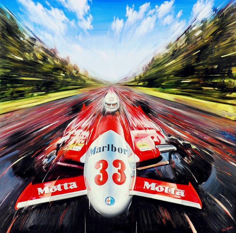 Ferrari 312 T2Rimanendo nei nostri territori, Andrea del Pesco, artista di Motoring Art, dipinge Niki Lauda mentre guida la Ferrari 312 T2 a Nürburgring nel 1976, prima dell’incidente.Quell’evento tragico, che è nella memoria di tutti gli appassionati di F1, ha ispirato l’artista che ha prodotto questa opera su tela con colori ad olio. Andrea del Pesco trova spesso ispirazione nella Ferrari, e si vede in parecchi dei suoi quadri.
