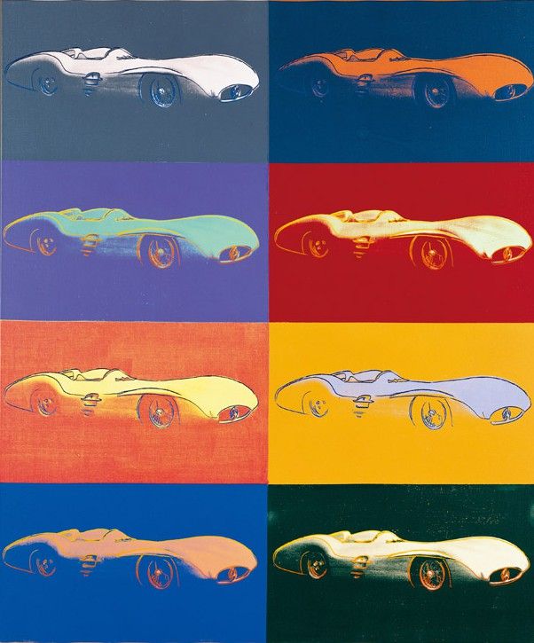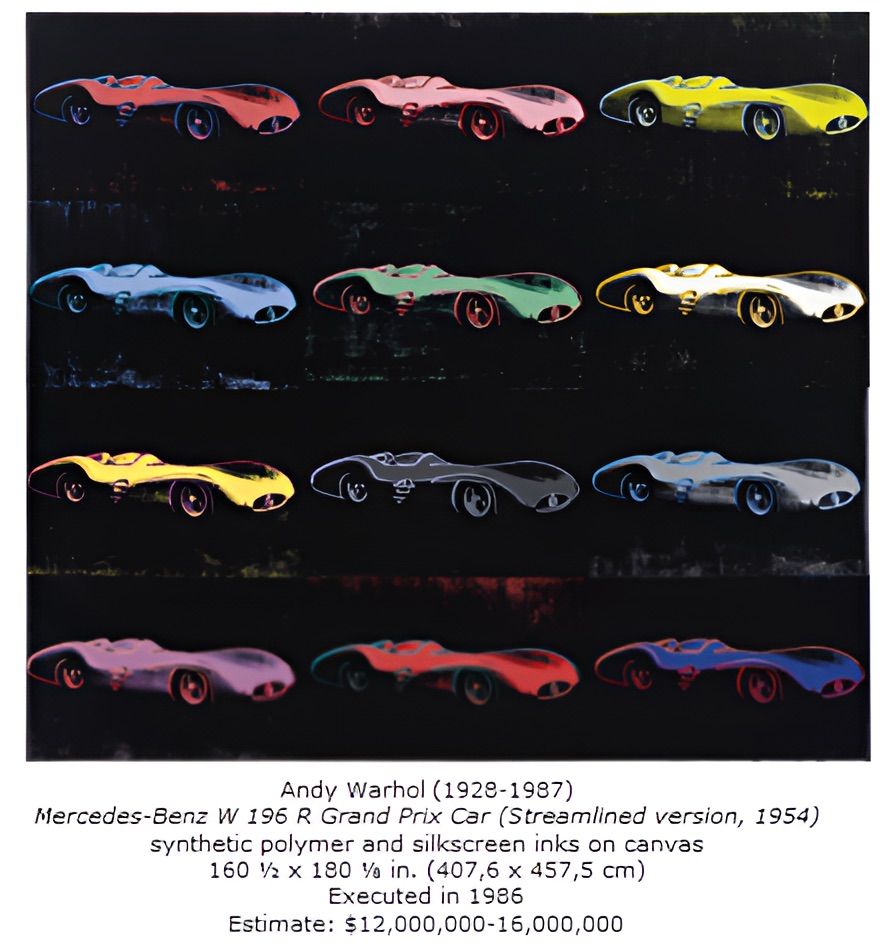 Mercedes - Benz W 196Forse non è l’opera più famosa di Andy Warhol ma di sicuro è una delle sue più monumentali: la Mercedes, rappresentata in questa tela di più di quattro metri di altezza, vinse 9 gare di Formula Uno su 12 nella stagione 1954/1955 e diventò per l’artista il simbolo della prosperità del dopoguerra e della sfida industriale.Fa parte della serie Cars, l’ultimo lavoro di Andy Warhol, e vale tra i 12 e i 16 milioni di dollari. Così come le scatole Brillo, la zuppa Campbell e la faccia di Marilyn Monroe, la Mercedes viene ripetuta per sedici volte e rappresentata in altrettanti colori su sfondo nero.