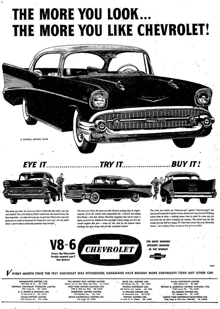 Passano gli anni e i pubblicitari devono ingegnarsi sempre di più per far emergere il prodotto.Arriviamo dunque negli anni ‘50 in casa Chevrolet e parliamo del modello Bel Air.La pubblicità, oltre al comfort, sottolinea anche le innovazioni tecnologiche dell'auto e l'attenzione ai dettagli nella sua progettazione.E’ importante sottolineare che fino a qui, quasi tutte le pubblicità automobilistiche avevano un tono positivo e riflettevano l'ottimismo e la prosperità dell'epoca post-bellica.