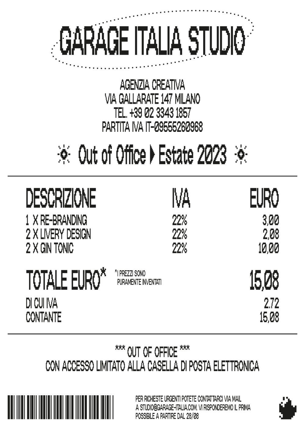 Immaginatevi a Milano, in ufficio, a fine luglio.Il caldo torrido pervade le strade, rendendo l'aria quasi irrespirabile. Resistere all'aperto è un'impresa ardua e l'attesa delle vacanze estive si fa sempre più palpabile.Come mantenere alta la produttività in ufficio?In Garage Italia Studio, abbiamo indetto una sfida tra i membri il nostro team di design, introducendo un elemento di sana competizione per mettere un po' di pepe alla realizzazione dei contenuti del nostro piano editoriale di agosto.Il concept che ci ha guidati in questa sfida è il tanto desiderato avviso di Out of Office, un inno alla libertà creativa e al relax che ci aspetta. Via i computer, stop alle email, basta con le call: è giunto il momento di dare spazio all'immaginazione.Ogni membro del team ha accolto la sfida con entusiasmo, dedicandosi alla creazione di contenuti in piena libertà, senza vincoli stilistici o brief troppo specifici.A rendere il tutto ancora più stimolante, sarete voi a decretare il vincitore, votando l'artwork che vi piace di più.Per cui tenete d'occhio il profilo Instagram di Garage Italia Studio e fateci sapere con like e commenti il vostro preferito!