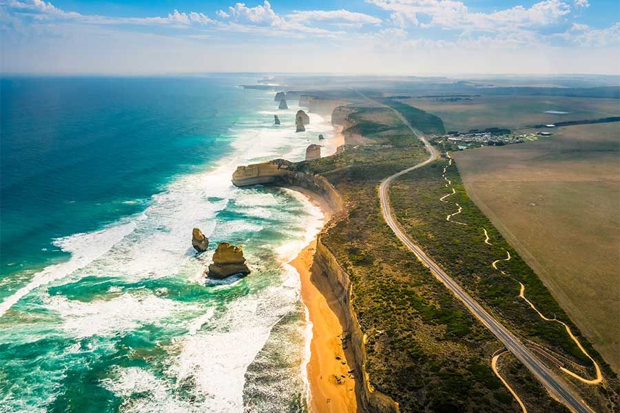 La Great Ocean RoadUna delle più suggestive strade panoramiche dall’altra parte del mondo. In Australia lungo la costa del Victoria, si snoda per 243 chilometri e offre paesaggi mozzafiato sulle acque cristalline del mare australiano, spiagge di sabbia bianca, foreste rigogliose e scogliere a picco sul mare. Uno dei punti da visitare è sicuramente quello che vedete in foto, chiamati i 12 apostoli, delle rocce calcaree monumentali.
