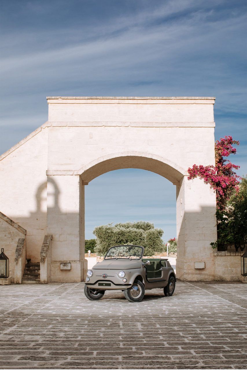 Borgo Egnazia, contiguo al parco archeologico di Egnazia nelle campagne di Savelletri, è il relais che ha sedotto Madonna e fatto da scenario per le nozze di Justin Timberlake e Jessica Biel, solo per citare un paio di nomi che si sono fermati da queste parti. Borgo Egnaziaè un luogo magico, un’ode alla Puglia che ritroviamo dappertutto: nel tufo e negli altri materiali utilizzati, nel progetto curato dal fasanese Pino Brescia, e nel personale che vi lavora. ‘Nowhere else’ è un vero e proprio mantra che esprime in due sole parole (in inglese, ok, ma immediate per chiunque) la filosofia del Borgo. ‘Da nessun’altra parte’ appunto, quello che questo relais può offrire è una full immersion di pugliesità, ben lontana dalla frenesia festaiola che offre il Salento. Qui si gode delle ‘piccole’ cose, che poi a pensarci bene sono tutt’altro che piccole e banali: si gode della cordialità dei local advisor che coccolano i clienti nelle stanze della corte, di lunghe pedalate nel verde, nelle ville con piscina dedicata, nelle piccole abitazioni che fanno capolino sulla piazzetta, fulcro delle attività all’interno del Borgo, interamente ricostruita con tanto di torre orologiaia. Per questi ed altri mille motivi che non stiamo ad elencarvi è sicuro che la Puglia non passerà mai di moda. Così come siamo certi che un’altra icona non verrà scalfita dallo scorrere del tempo e da mode passeggere: lei, la Fiat 500. E quando l’innovazione del progetto Icon-e by Garage Italia e il fascino senza tempo della Fiat 500 Jolly incontrano la magica atmosfera di Borgo Egnazia, nasce un’edizione speciale della mitica spiaggina anni ’50 per rendere omaggio al simbolo dell’ospitalità pugliese in tutto il mondo.