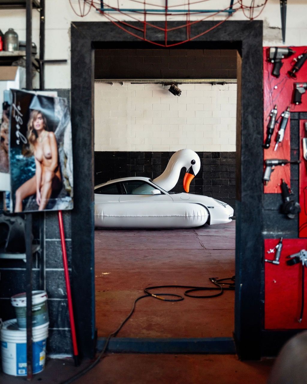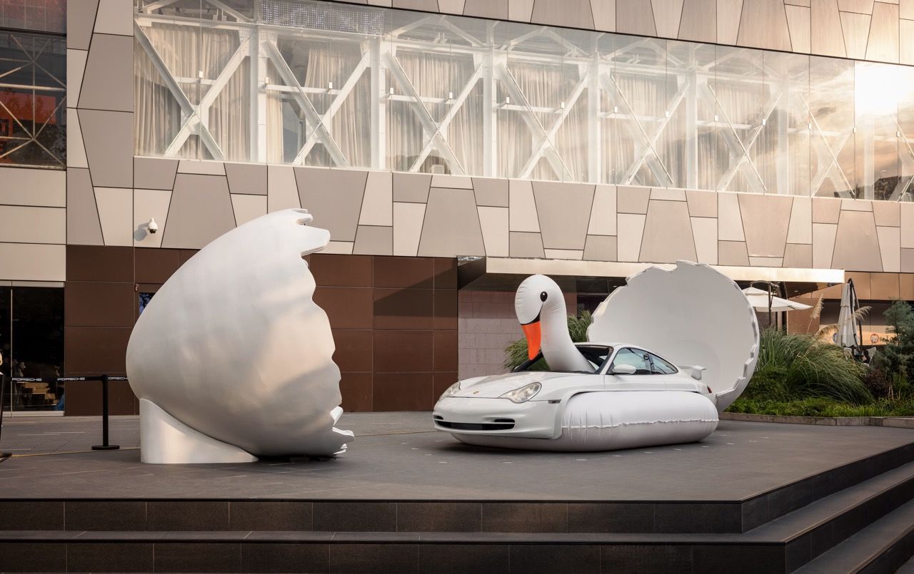 iconici di Porsche, inseriti in contesti improbabili e surreali, oppure assemblati insieme a materassi